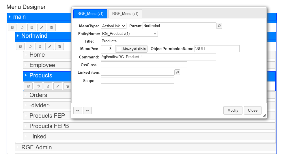 Under the RGF-Admin/RGF Menu section, it is possible to edit the menu structure at runtime. Apart from designing custom menu items, you can associate different entities with menu items and display them accordingly.