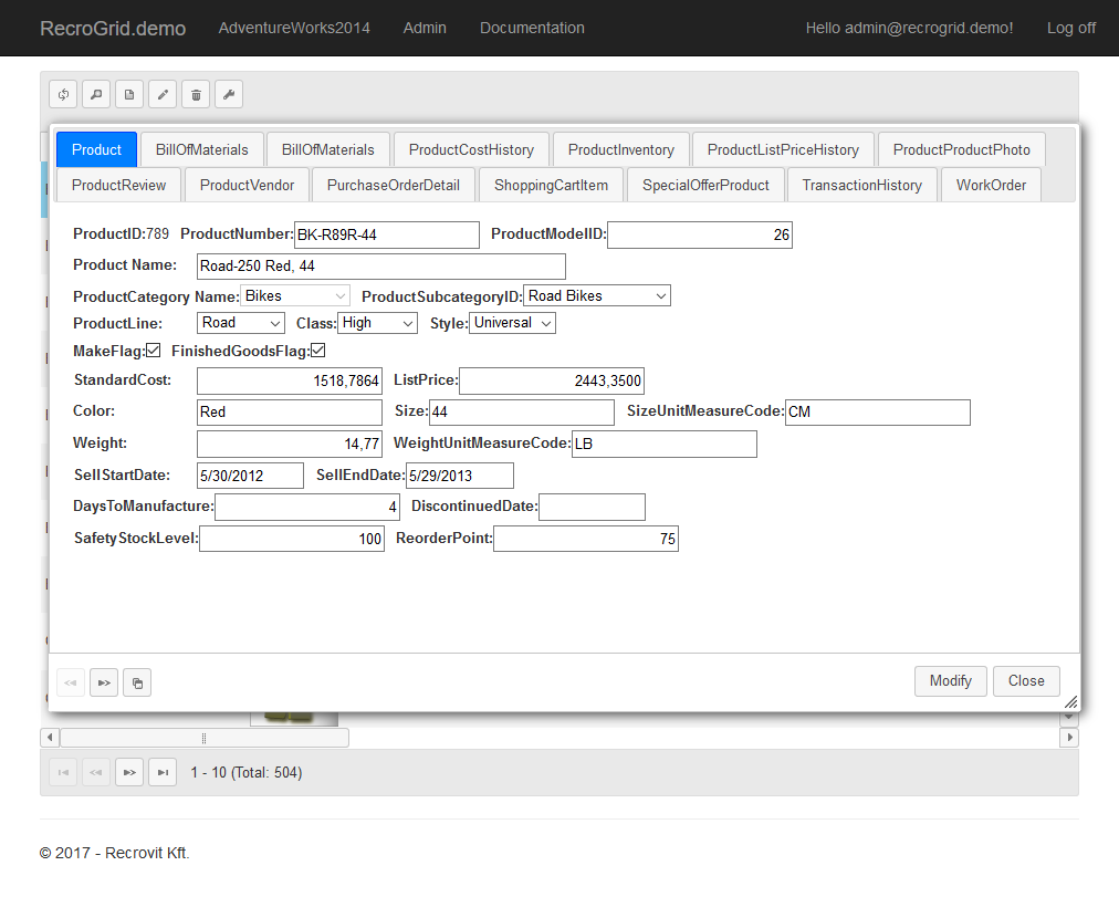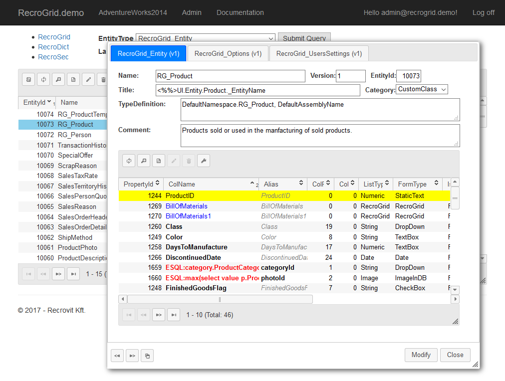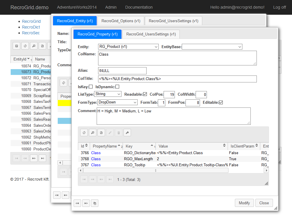 A alkalmazás /RGF/Admin útvonalán az összes entitás paraméterezése elvégezhető.