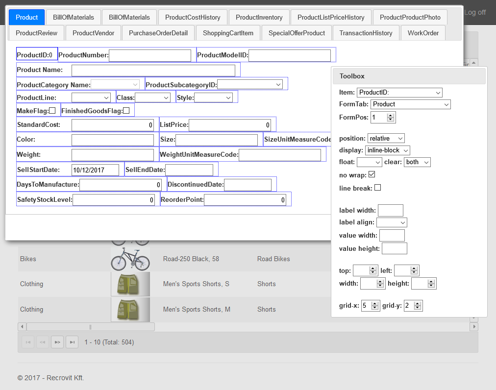 A Form nézet a List nézet egy elemét bővített tartalommal külön dialóguson megjeleníti. Az ablakon megjelenő adatok az entitás paraméterei és egy előre definiált template alapján dinamikusan jön létre. A dialógus kinézete online felületen szerkeszthető és menthető. Az ablak az előre definiált paraméterek alapján egyetlen sor kód írása nélkül azonnal működik, a típusnak megfelelő mezők használatával, illetve az adatbázis szerkezetből átvett paraméterek alapján (pl. kötelező mező, szöveg hossza).